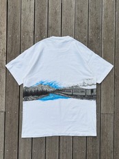 アメリカ、アラスカ州のスカグウェイ鉄道の列車と風景が両面巻きでプリントされたTシャツです。