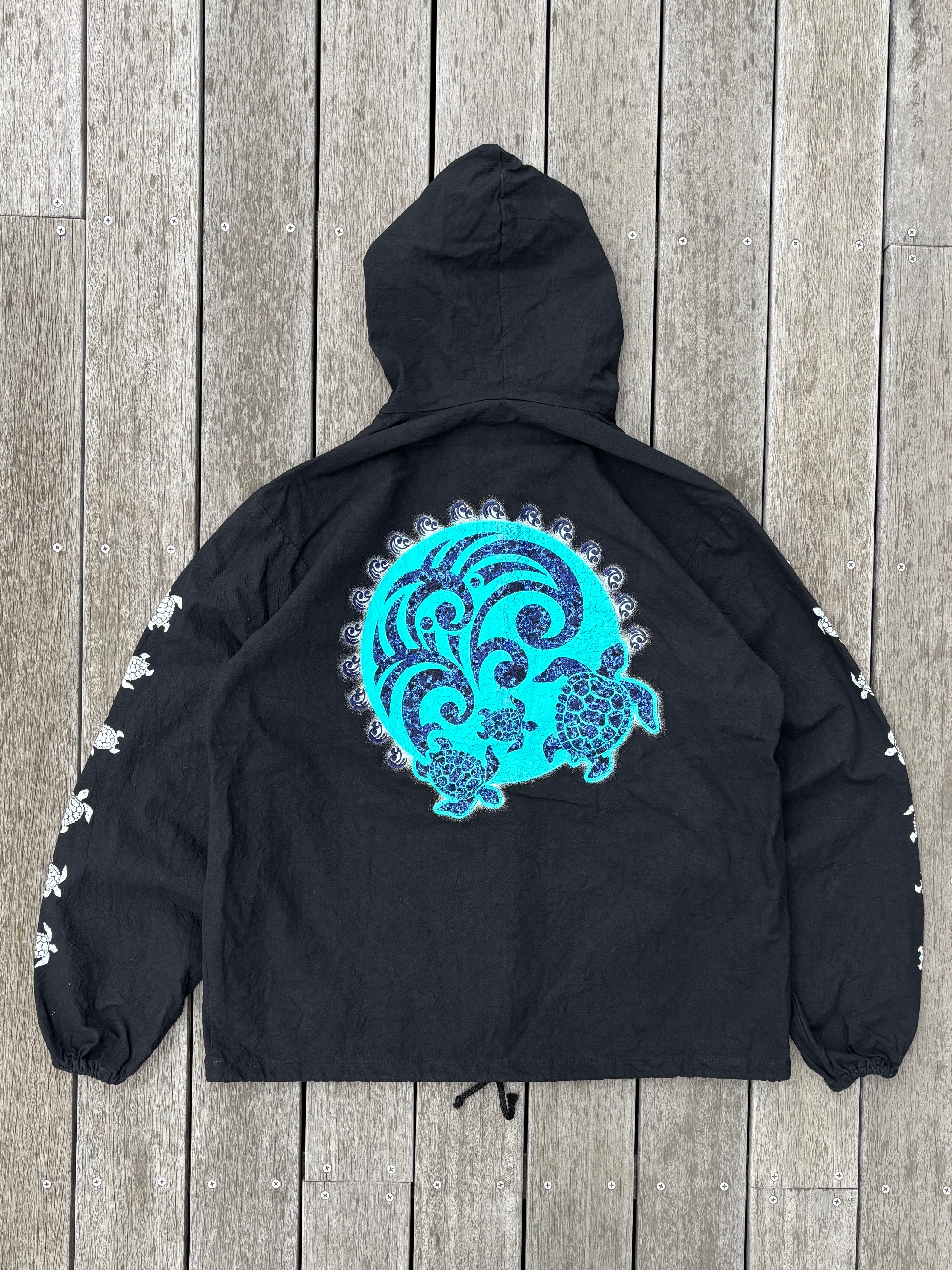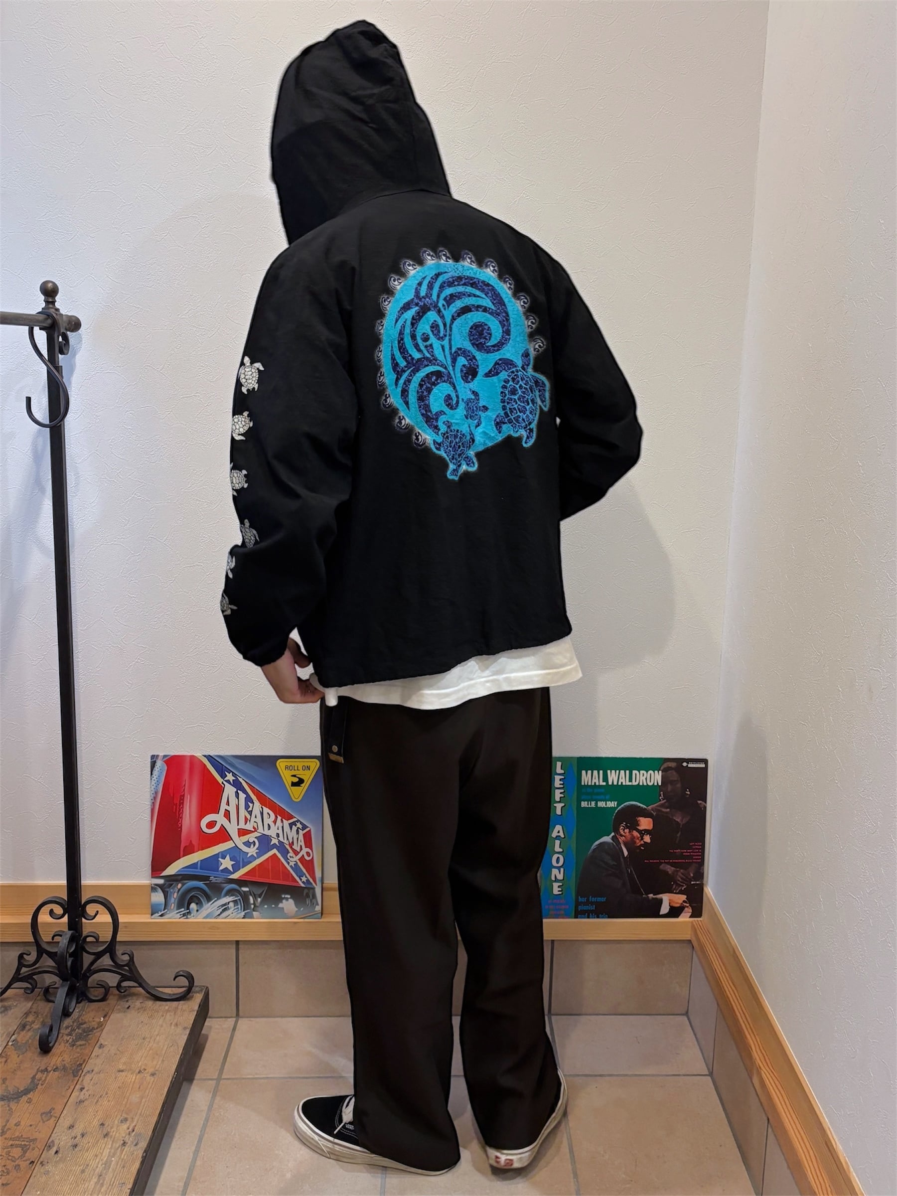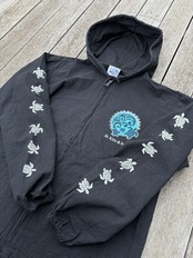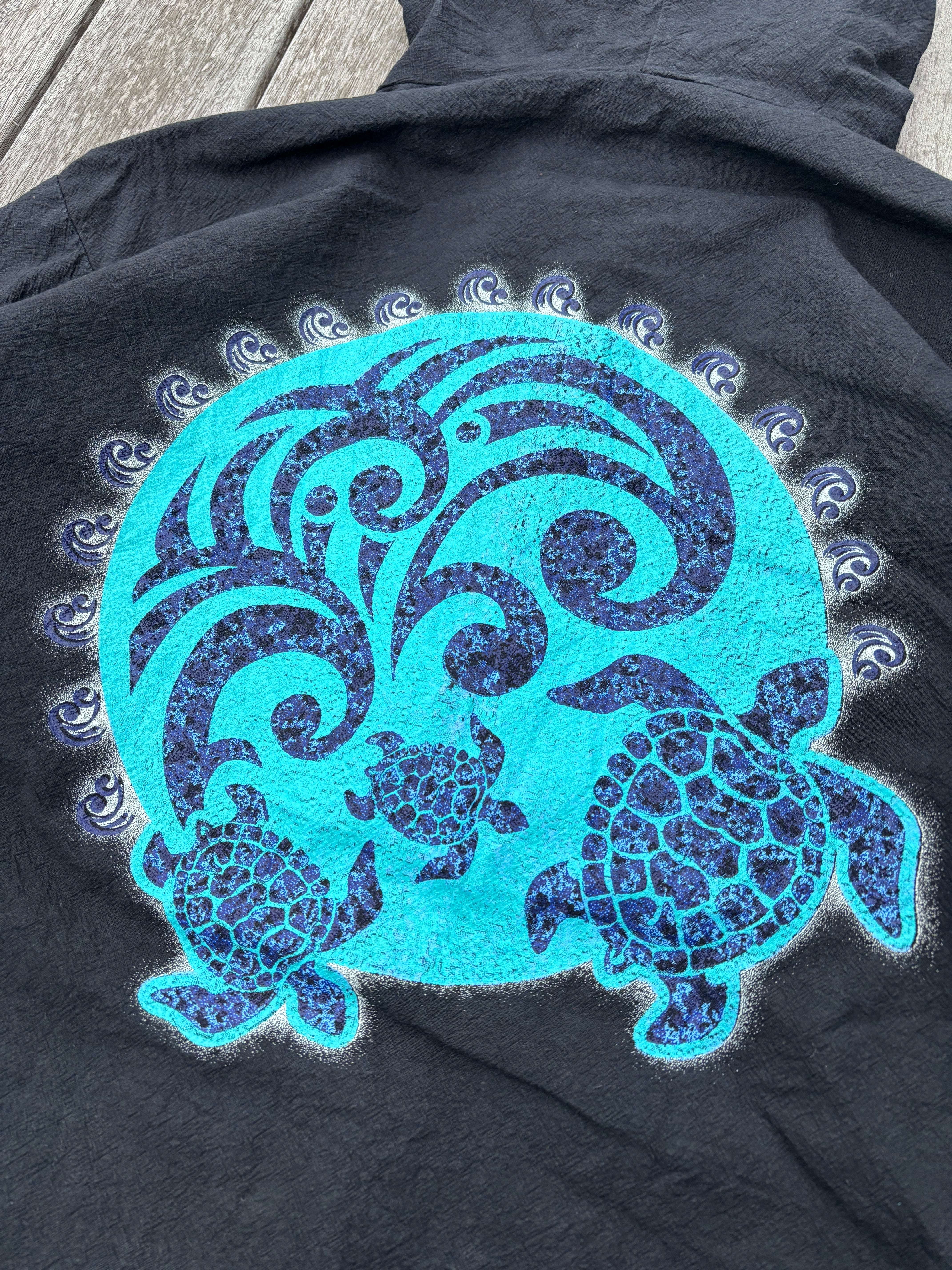 西インド諸島のカリブ海、「セントキッツ・ネービス」の地名がフロント左胸に入っていて、両袖にはウミガメのプリント、バックプリントはウミガメと海を連想させるプリントが厚塗りで入っています。