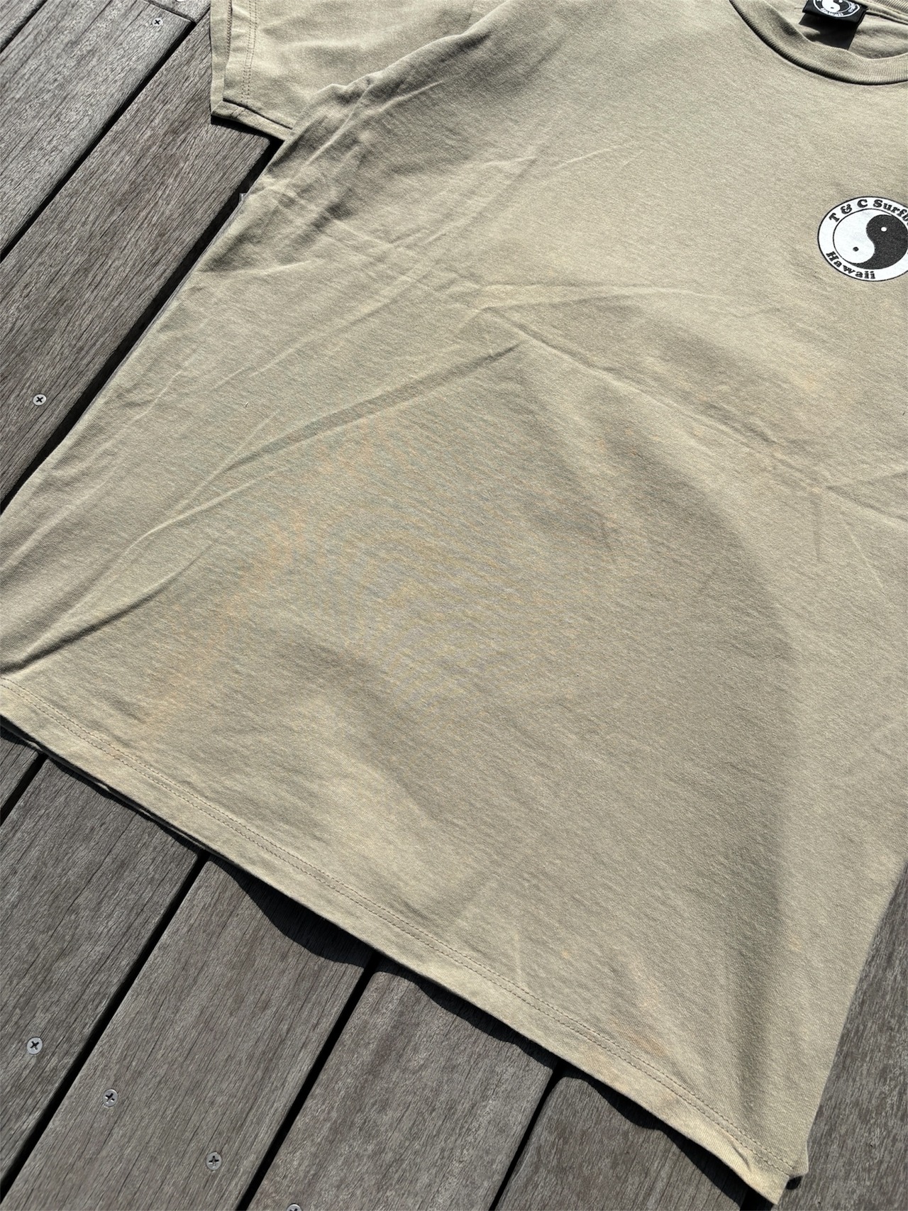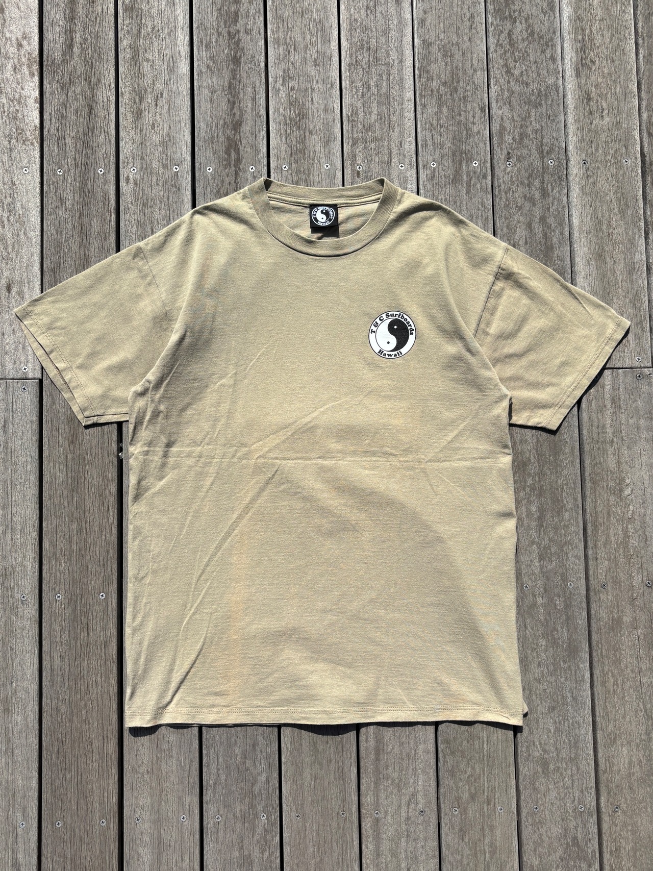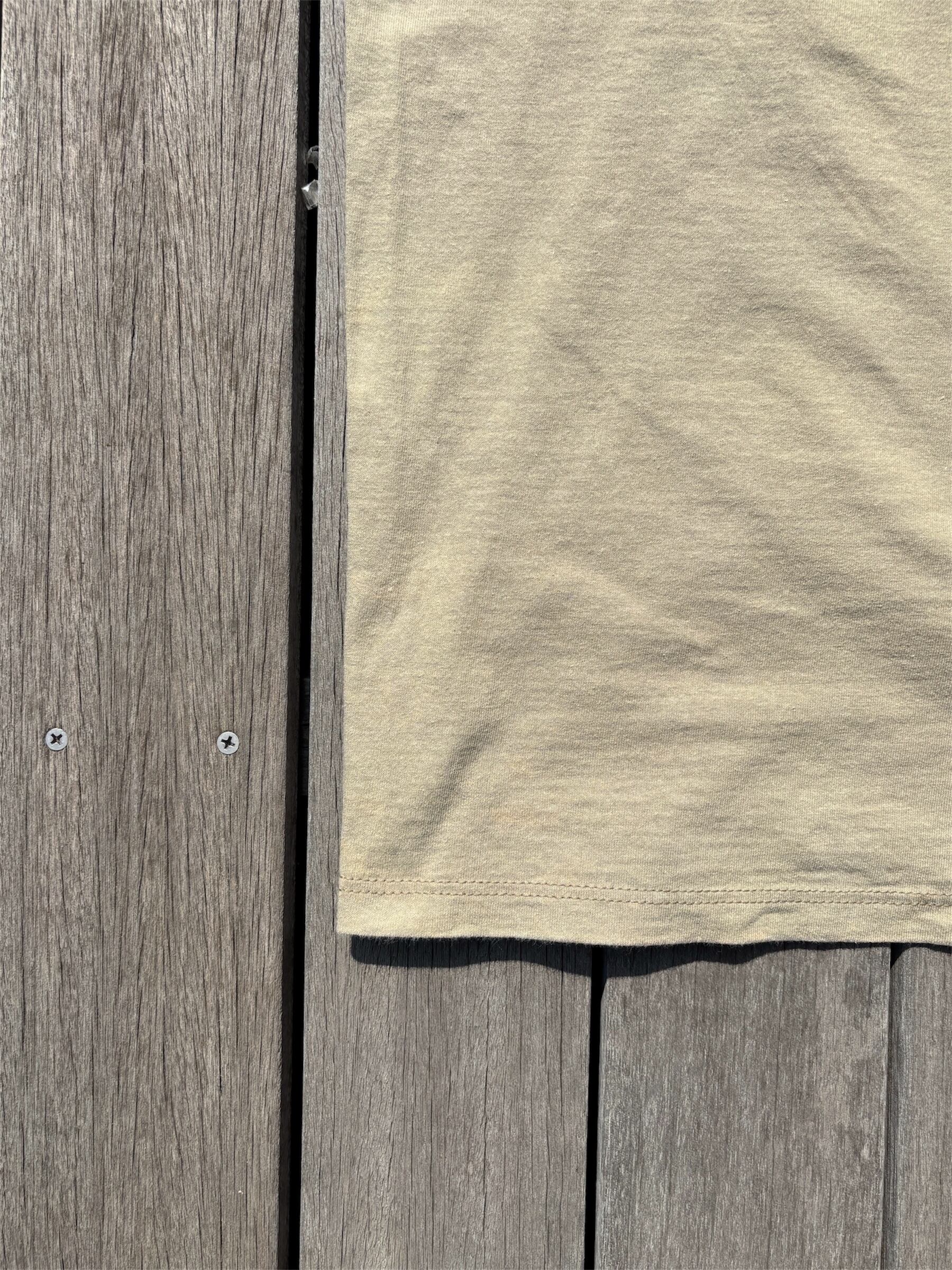 カラーはオリーブとベージュの中間のような配色で、フロント左胸とバックの両面プリントです。