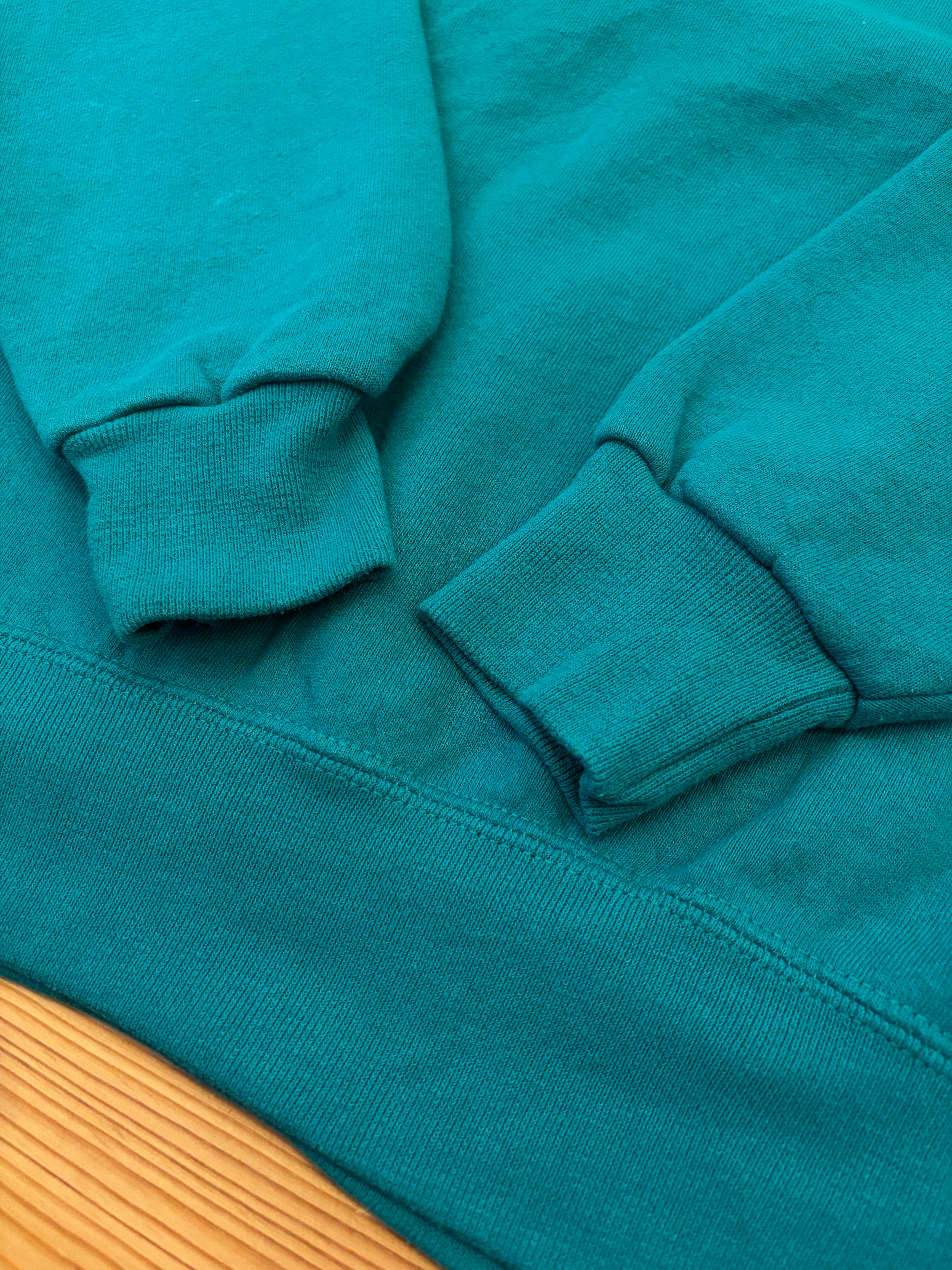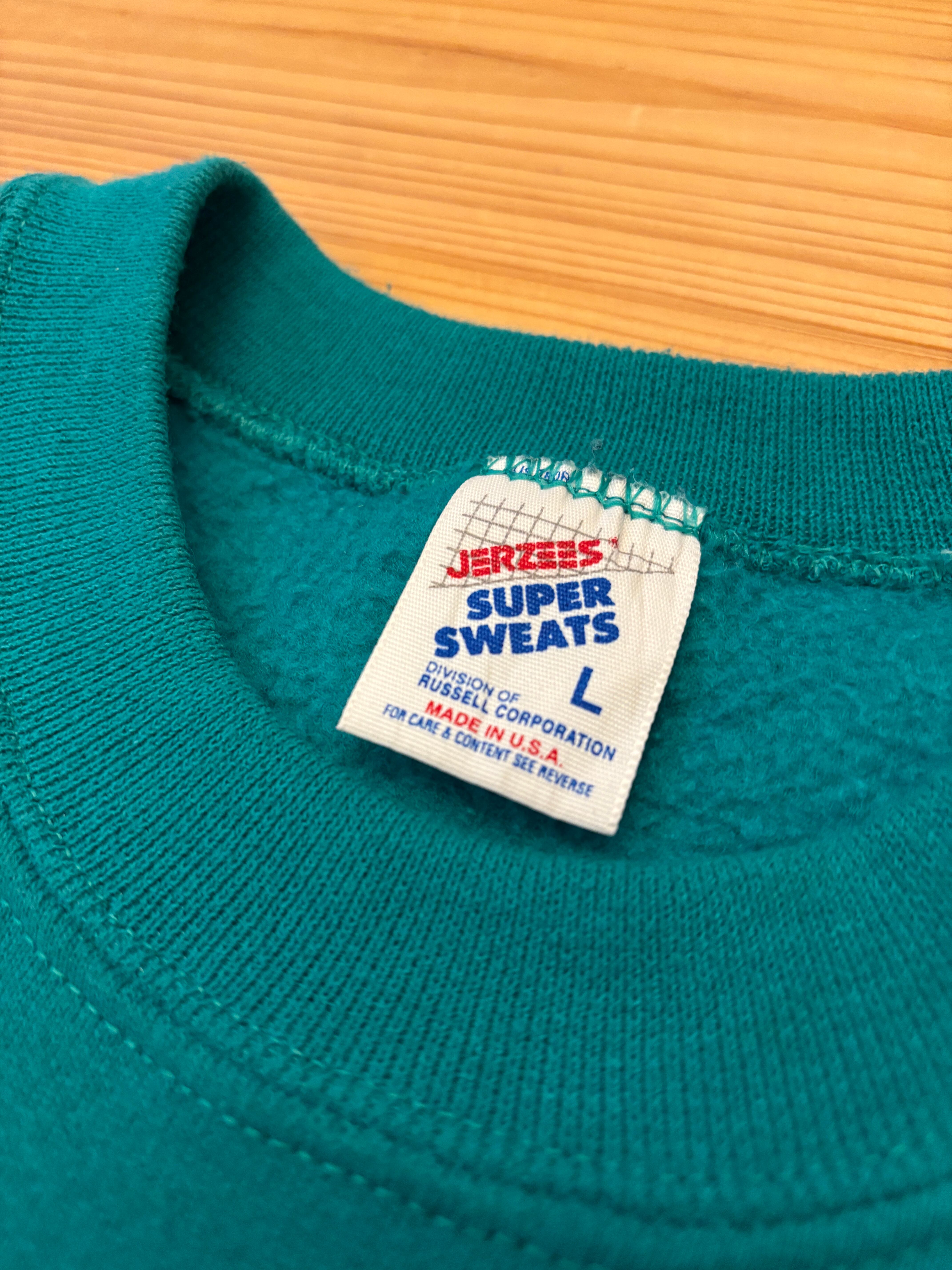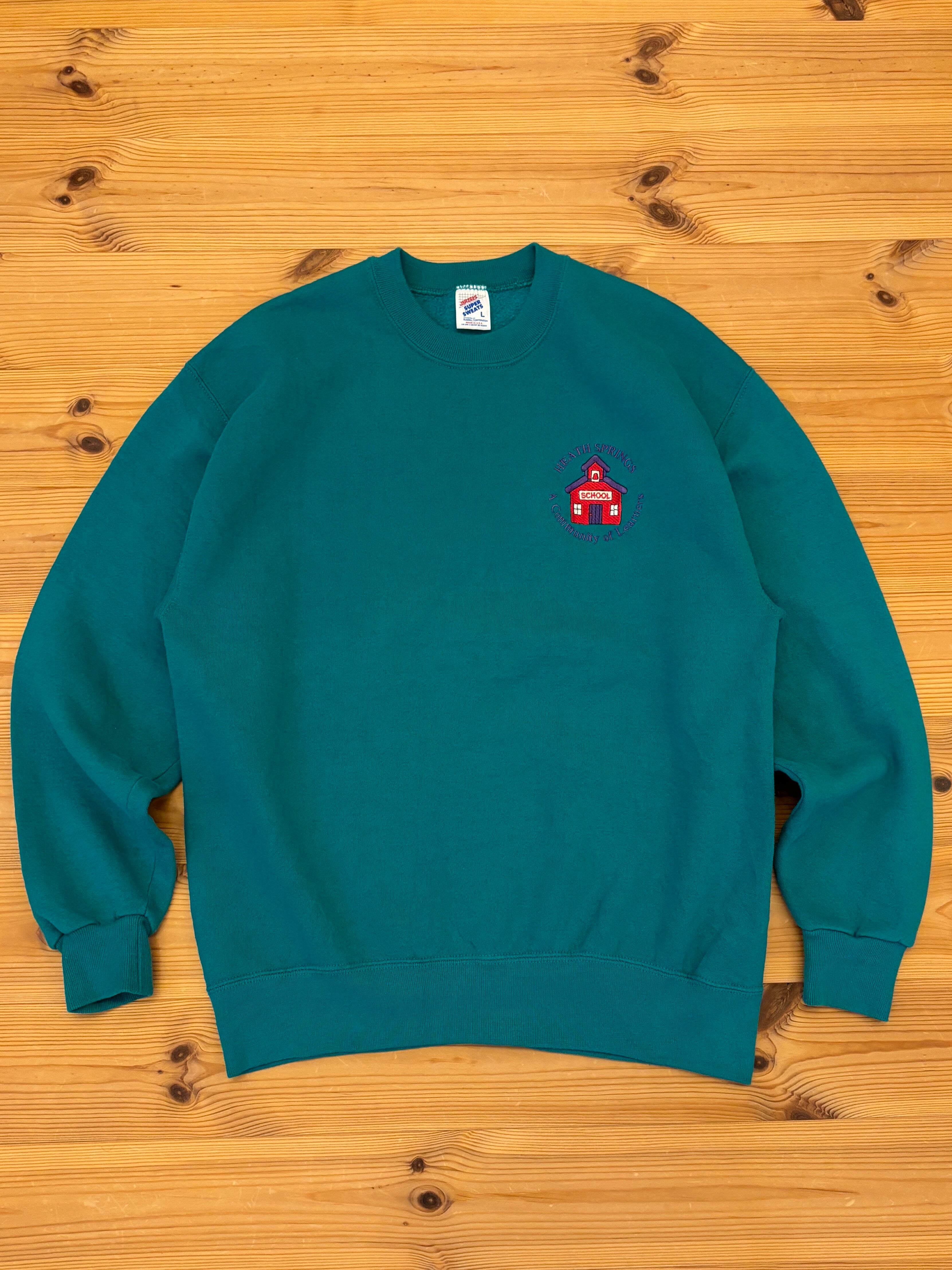 カラーはエメラルドグリーンで、左胸にユニークなスクールイメージの刺繍が施されています。