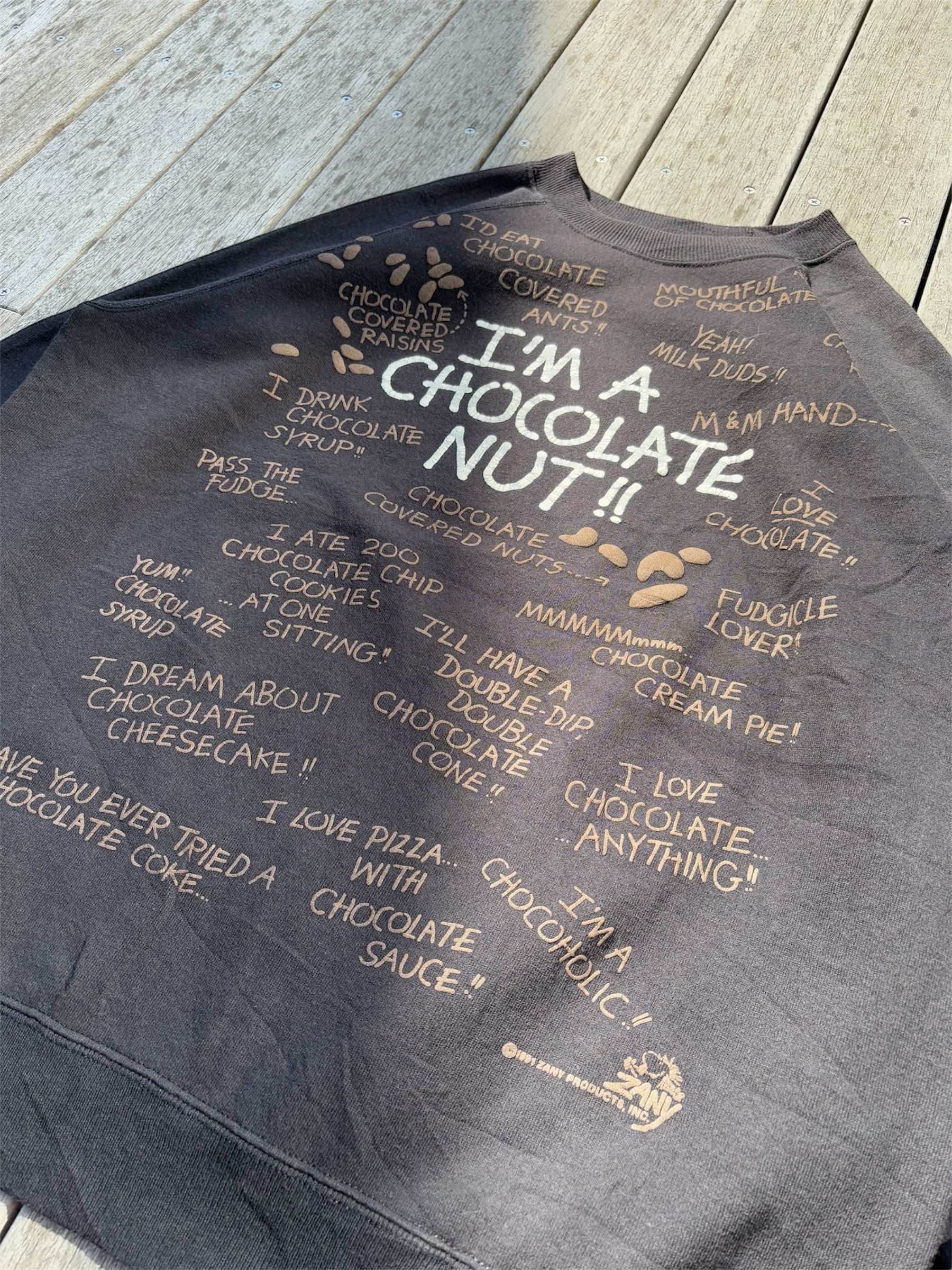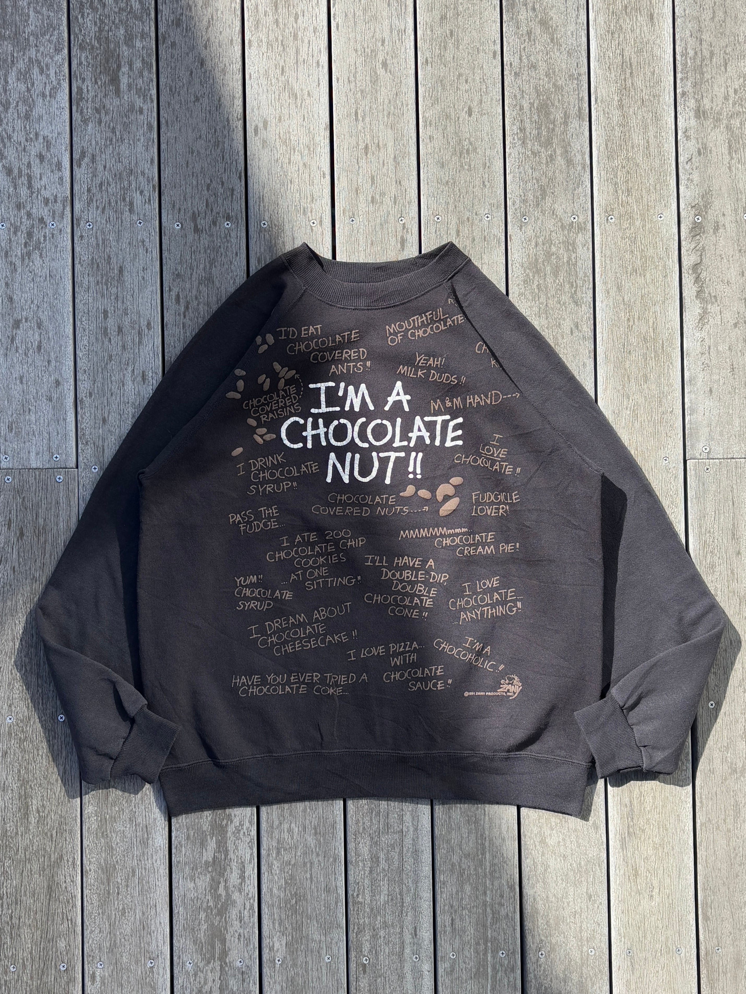 90's "Im a chocolate nut!!" All Over Print Sweat XL / チョコレートナッツ チョコレート チョコ 発泡プリント スウェット 古着 ヴィンテージ ビンテージ | Good Slow Morning