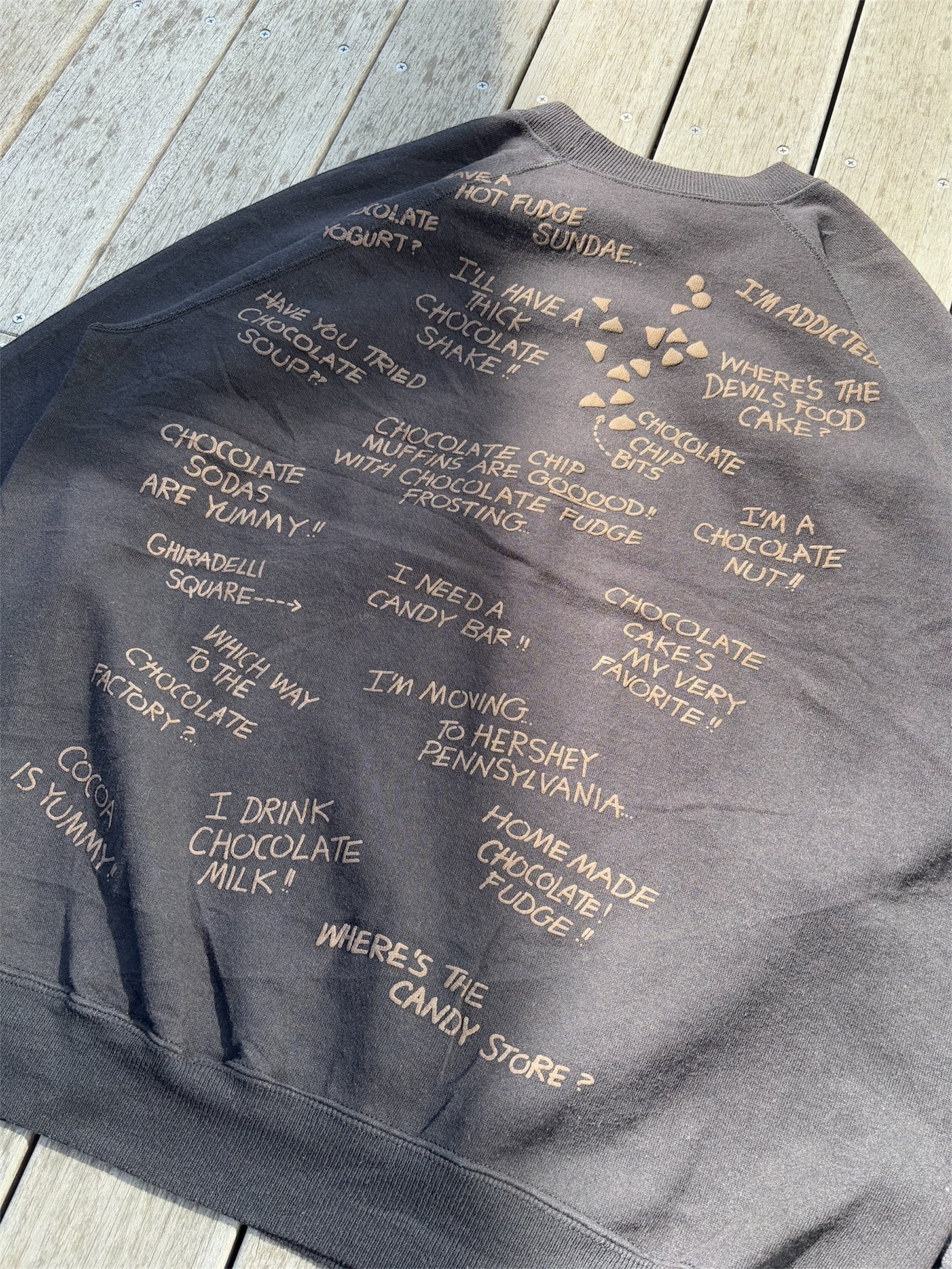 両面に、チョコレートに関する様々なユニークなフレーズが書かれたスウェットです。