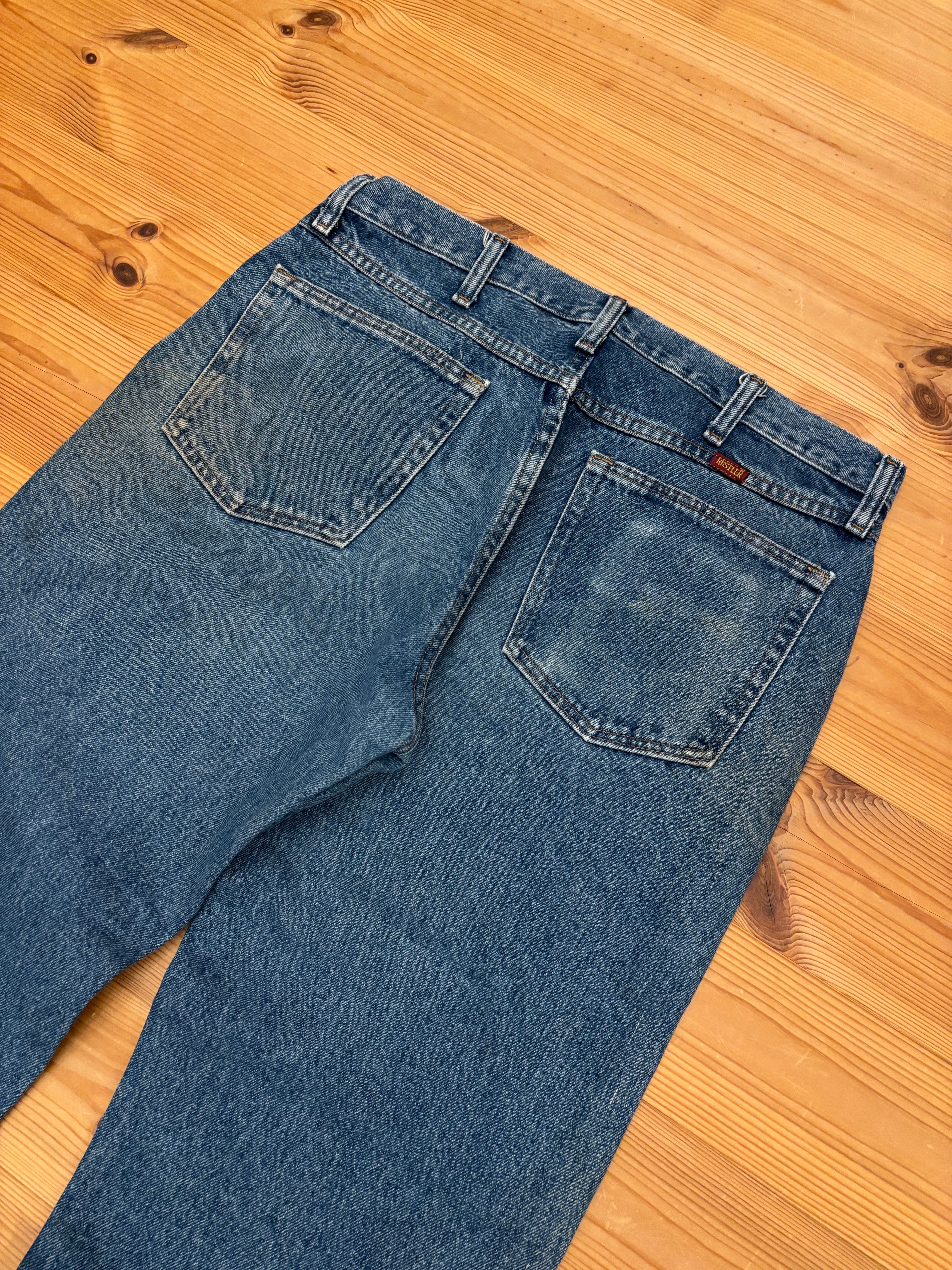 前面両膝付近色落ち、汚れ、背面右ポケット色落ち跡、左ポケット下付近に薄いシミ有り。※画像参照