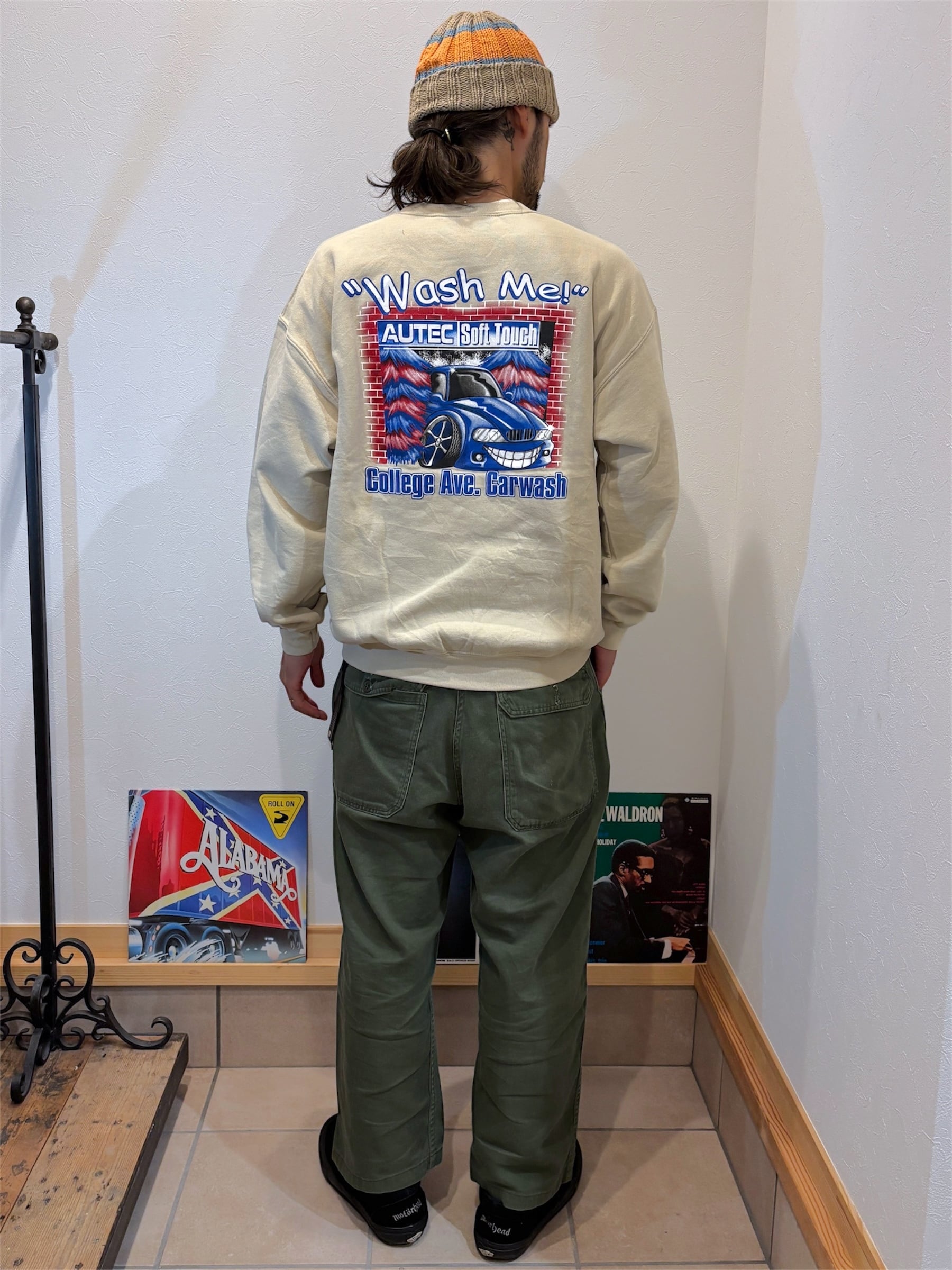 カラーはカーキで、バックにはアメリカらしいユニークな洗車中の車がプリントされています。