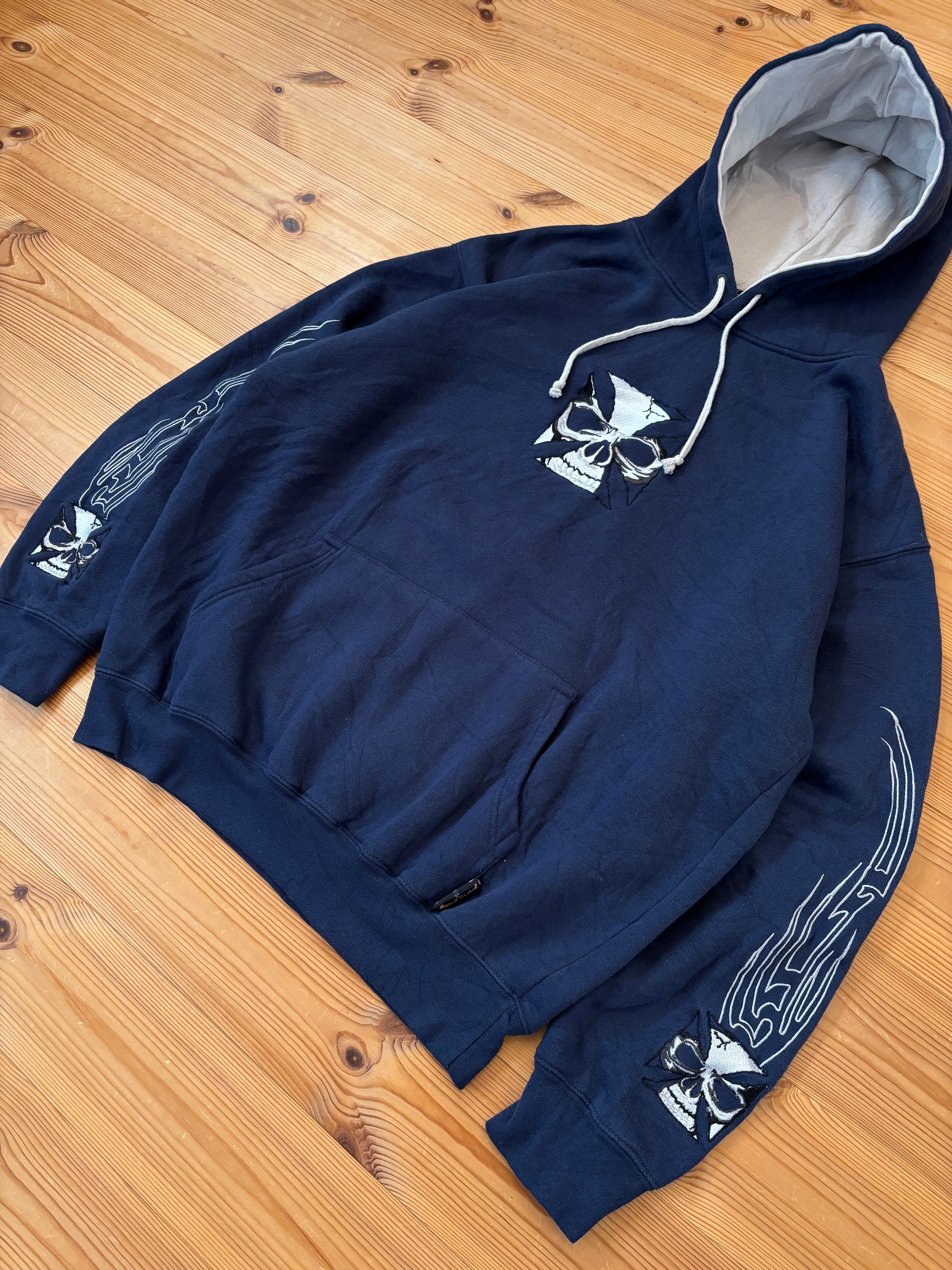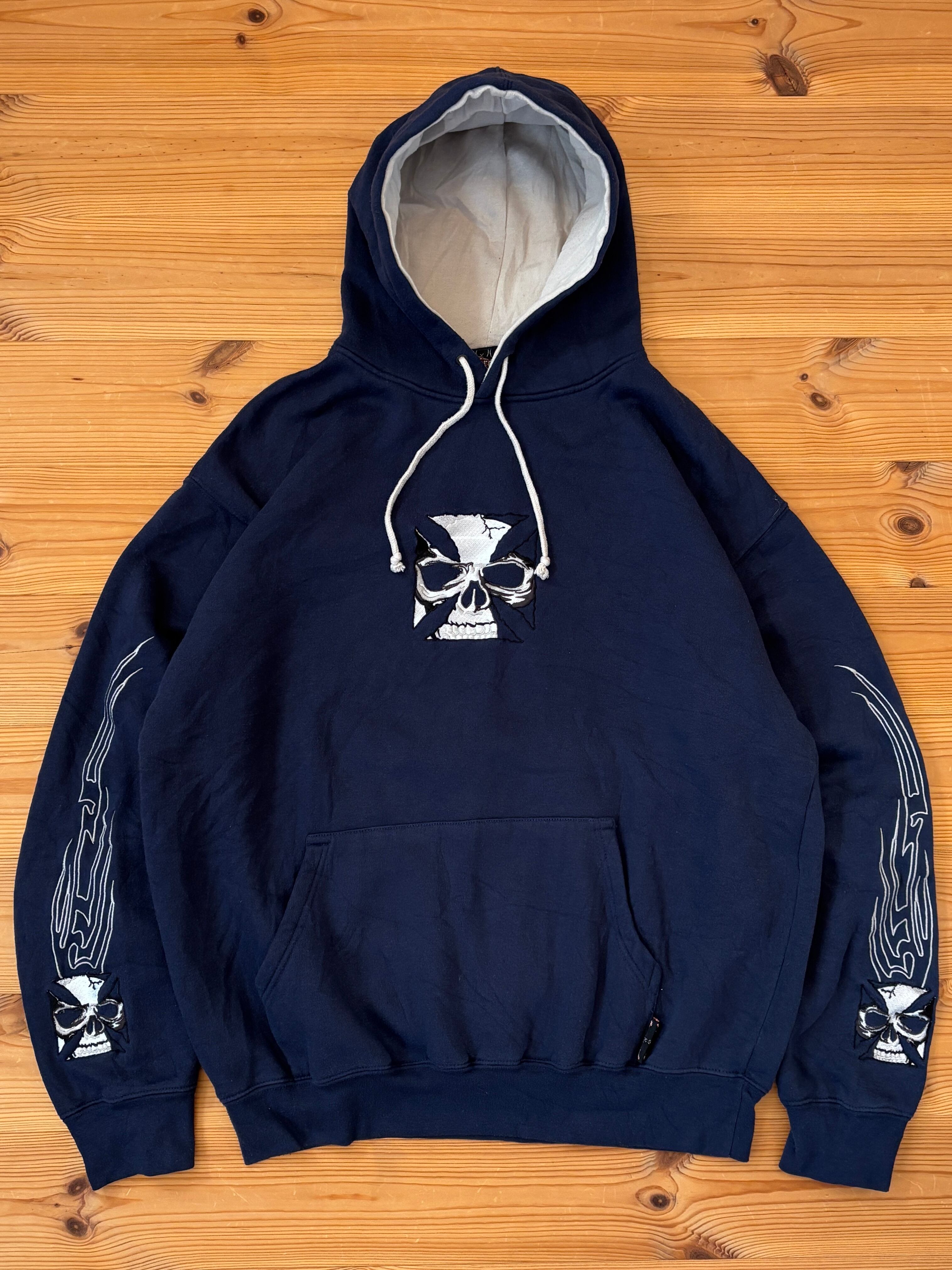 90's "Sapphire Lounge" Iron Cross Skull Hoodie / オールドスクール アイアンクロス プルオーバーパーカー フーディー オールドスケート チカーノ 古着 ヴィンテージ