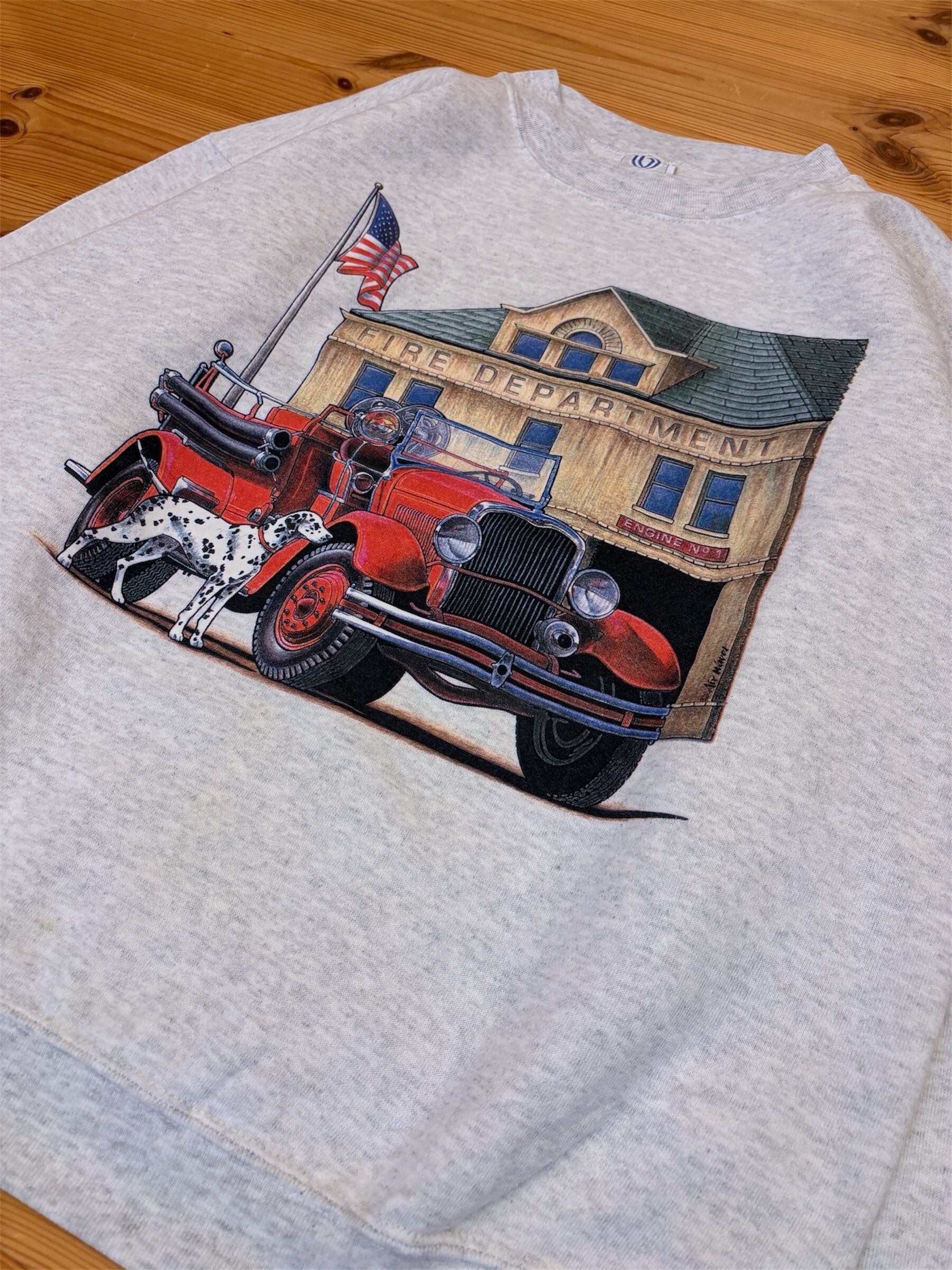 Won's Wear製のアメリカの消防署と消防車、ダルメシアンがプリントされたスウェットです。