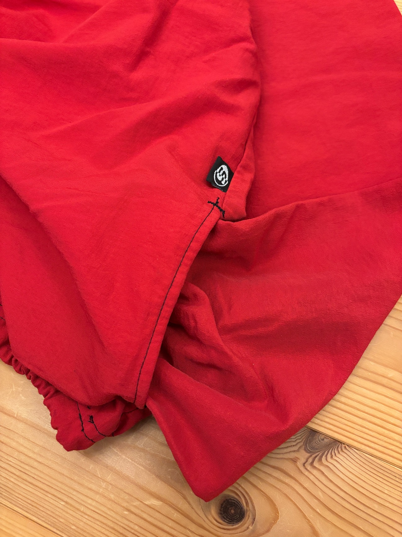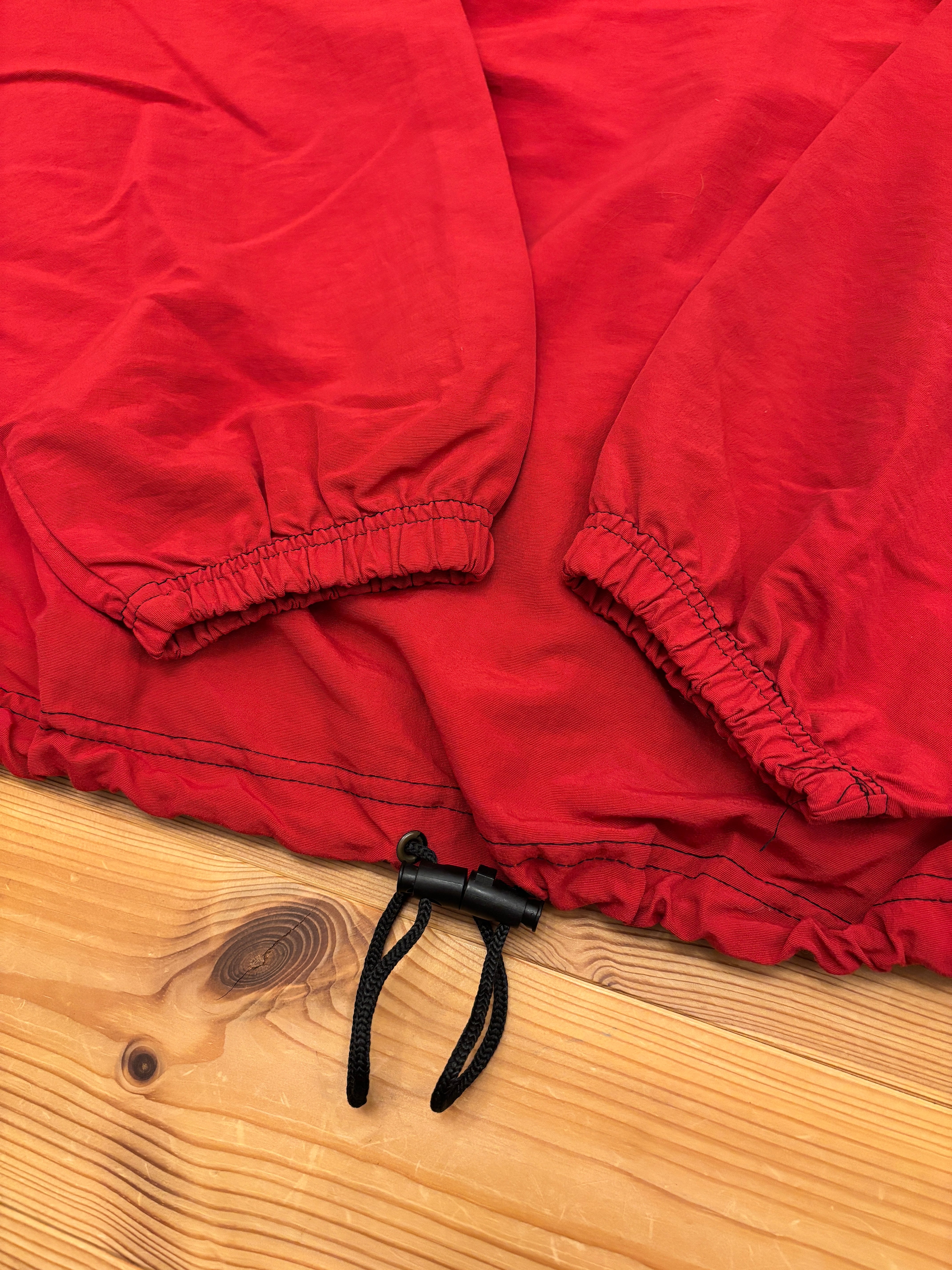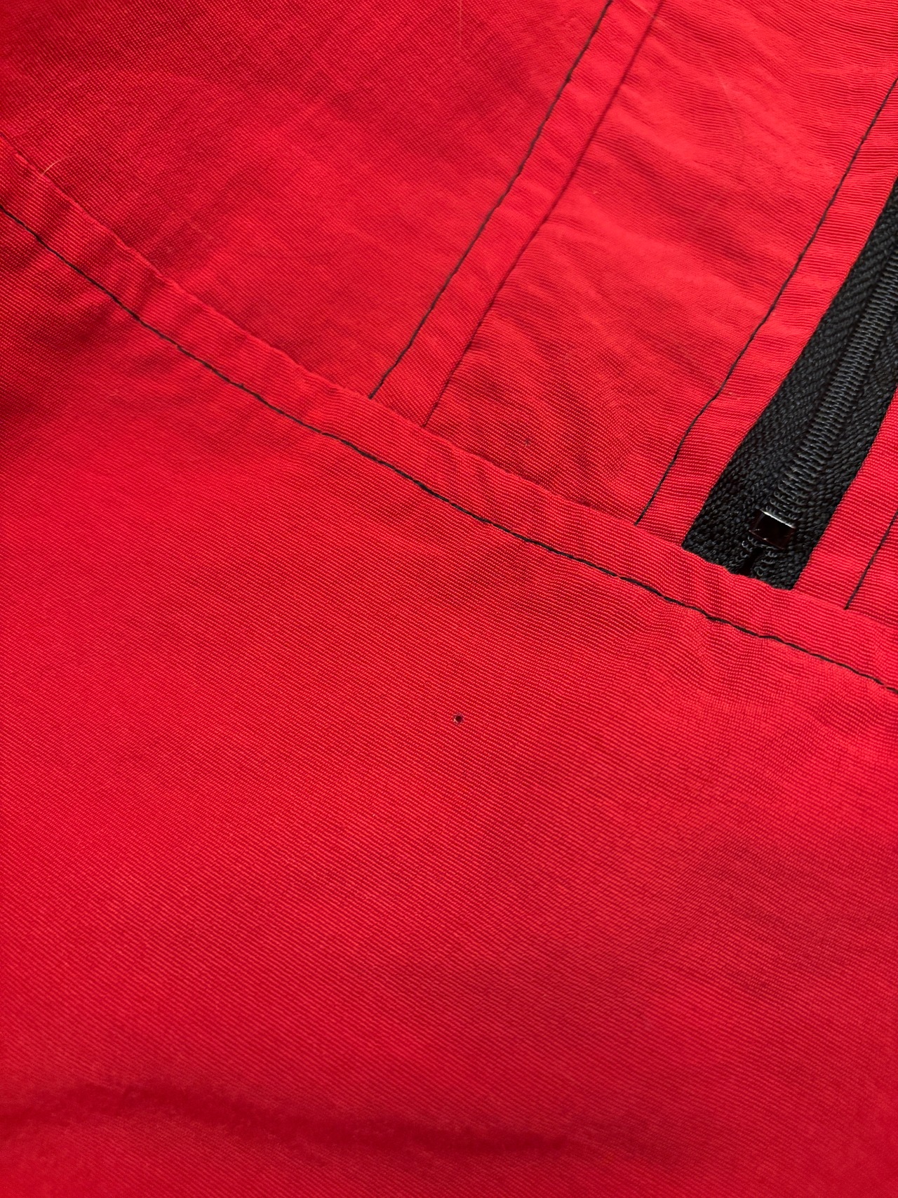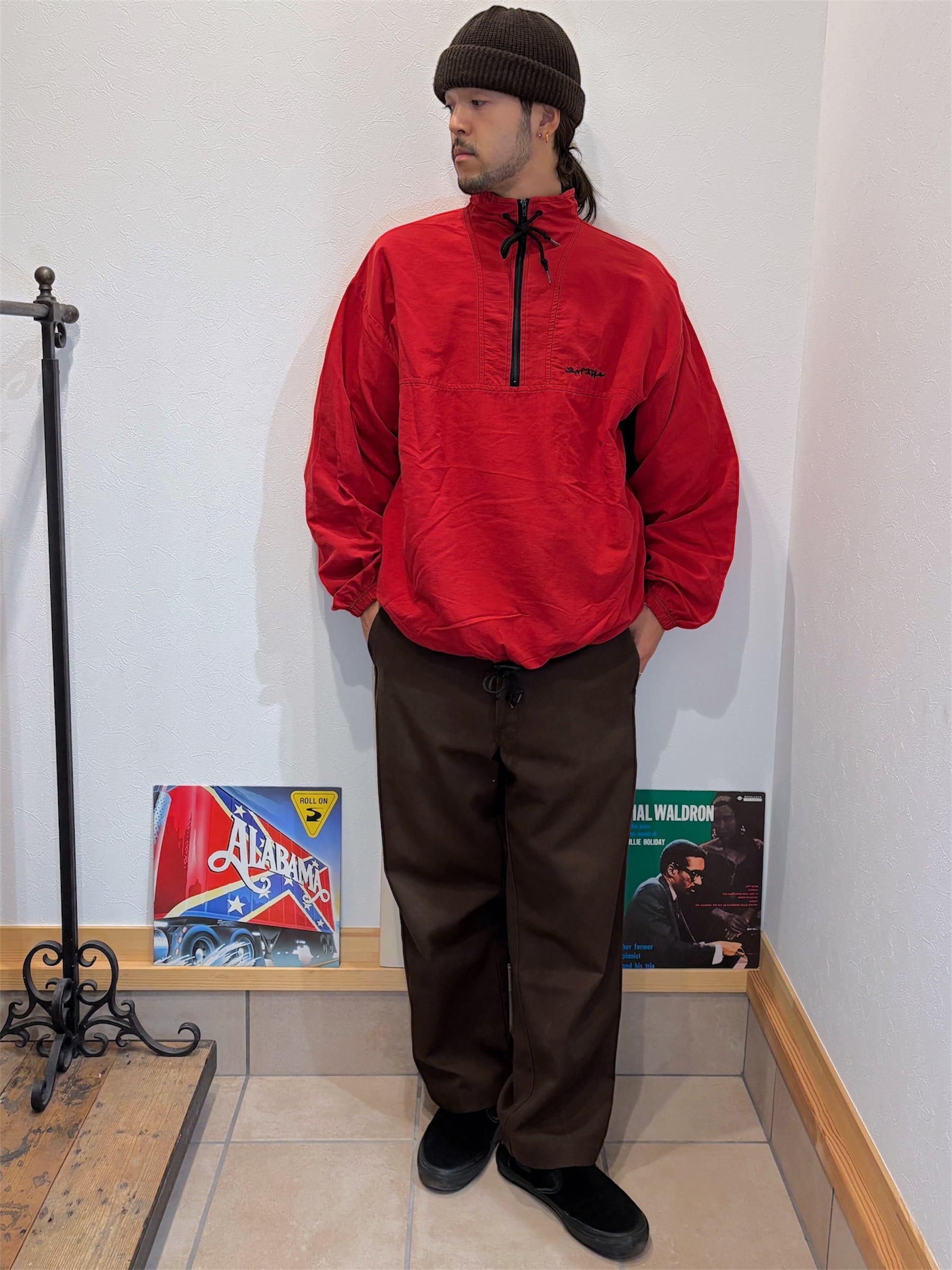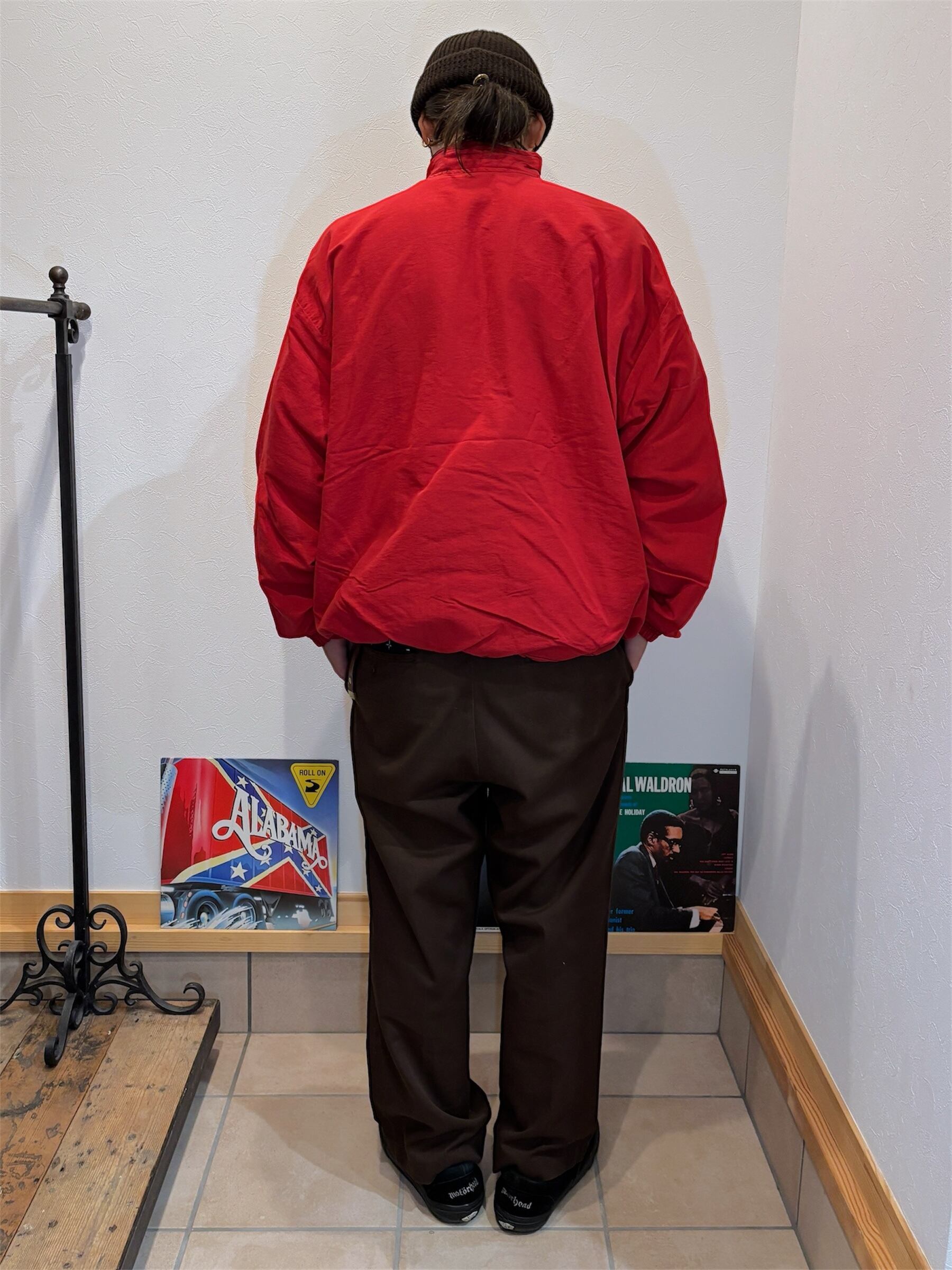 カラーはレッドで、左胸にカルチャー感溢れるフォントのロゴ、脇下はブラックの切り替えで90年代らしいデザインになっています。