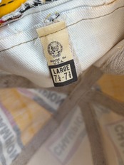 カラーはイエローで、ボックスロゴとスパークプラグ柄のコットン素材で作られた6枚接ぎです。