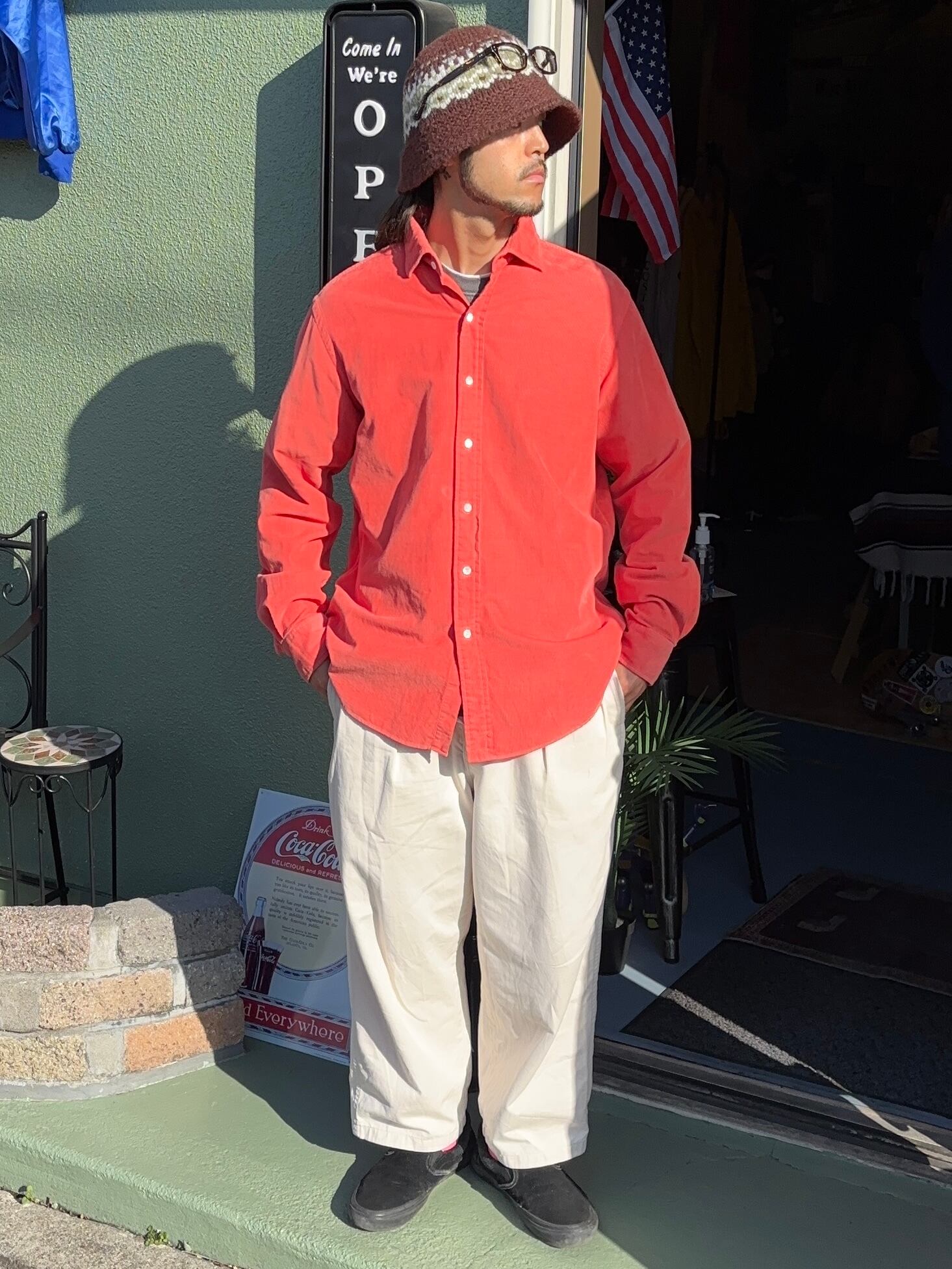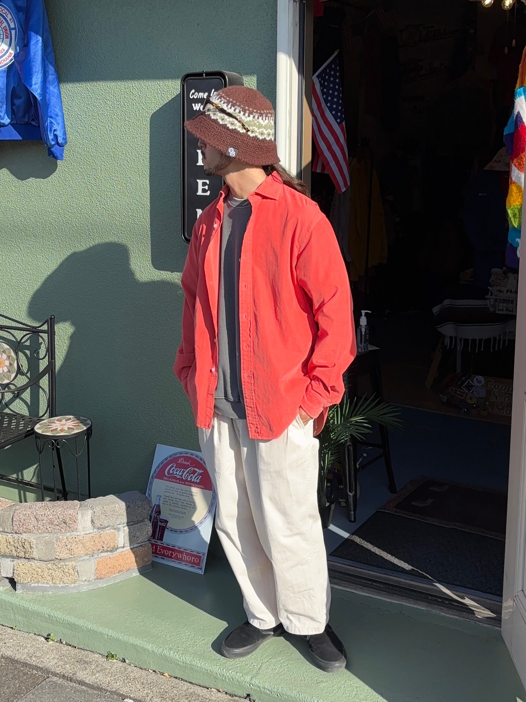 雰囲気の良いコーラルカラーで、細畝で柔らかい着用感。