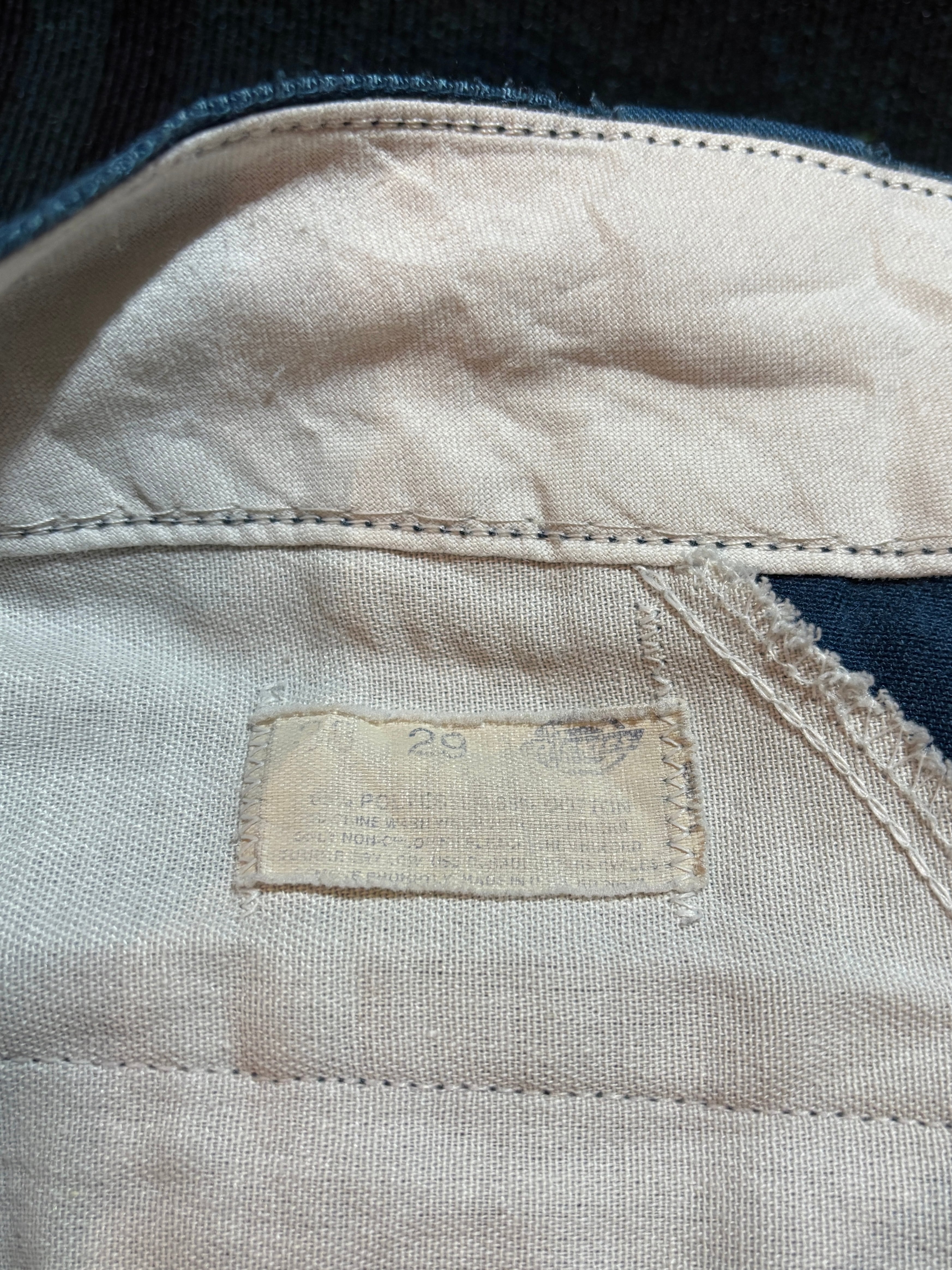 現行より太めのストレートシルエットで、ウエスト背面側の調整可能な縫い合わせや、バック中央の細ベルトループ、股上の深さなど、現行モデルにはないディテールです。